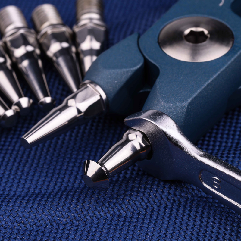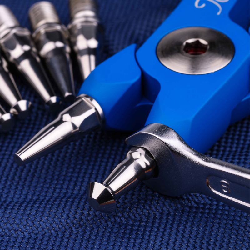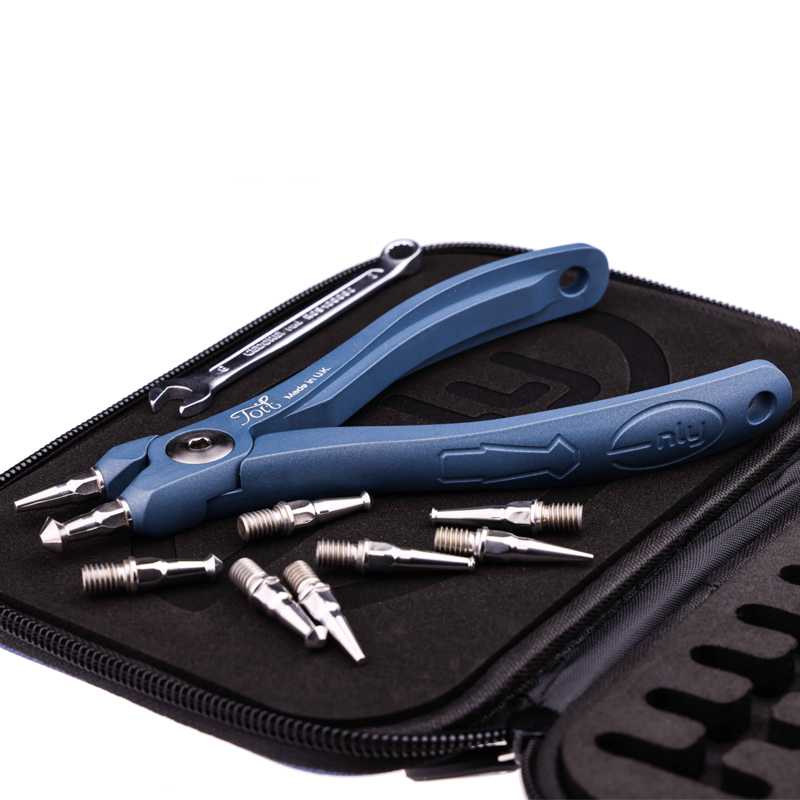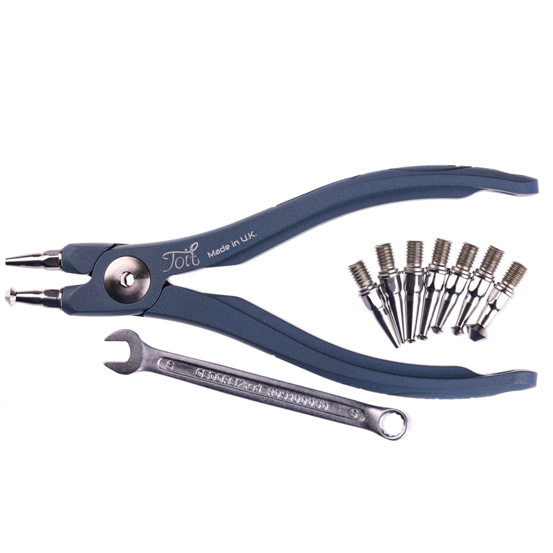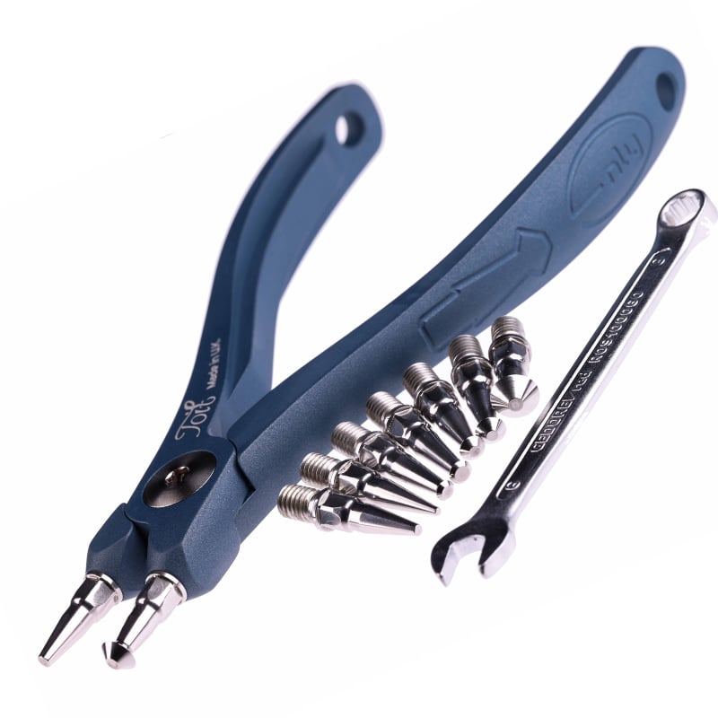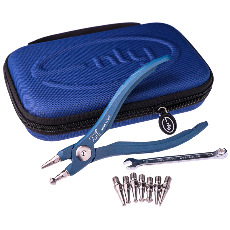Modular Split Ring Pliers Kit. Capable of opening size #1 – #12 Split Ring. 5-Axis CNC Technology, machined from Billet 6082 T6 Alluminium. Ceramic-Polymer Technology Coating, Prussian Colour Cerakote. Supplied with 9 X 440C Stainless Steel heat treated Inserts. Includes a 6mm Chrome Vanadium Gedore spanner. Including a Blue Polyester Thermoformed Molded outer Case with a EVA insert in both the lid and the base.